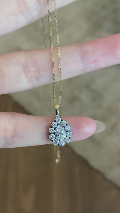 Capture the essence of vintage glamour with our Pear Cut Diamond Halo Necklace. The centerpiece is a mesmerizing 0.58ct Pear Cut (Teardrop) diamond, famed for its elegant, elongating shape. It is surrounded by a magnificent halo of substantial round brilliant diamonds totaling 0.75ct. This "cluster" setting technique amplifies the visual size of the pendant, making it look far larger than a single stone of the same weight.