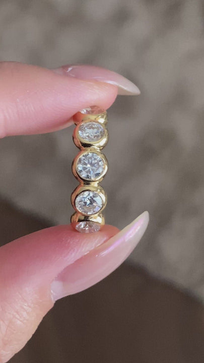 Enjoy the brilliance of a full eternity band without the worry. Our Bezel Set "Bubble" Diamond Ring redefines everyday luxury by encasing each of the 1.50ct Round Brilliant Cut diamonds in a sleek, protective rim of Solid 18K Yellow Gold. This creates a continuous circle of light that looks like floating bubbles on your finger.
